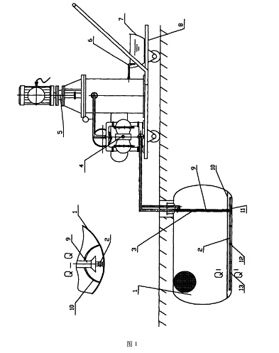 預先得知防爆儲罐內的存儲油(介質)使用底線(即加油機抽不到油為止,如25M3的防爆儲汽油罐,剩余油量約為0.8M3)。此時打開防爆儲罐1人孔蓋,將豎井內的防爆材料和豎井下部的清污隧道10移出罐外;將吸油管9(最好使用單個吸油管)插入到清污隧道10內,啟動氣動隔膜泵4將清污隧道10內剩余油污輸送給自動清洗過濾器5進行過濾,過濾后的清潔油不送回防爆儲罐,另外儲存到容器內,直到將清污隧道內的油污抽完為止。然后將設計多段的噴射橫管2放入到清污隧道10內。由于豎井的尺寸有限,噴射橫管2中間設計為能通過豎井放入到清污隧道10內為好,其余兩段或多段的噴射橫管與中間段噴射橫管用對接管頭對接一體,并用卡箍固定好清污隧道10內,再將噴射豎管2和吸油管9與其連接(如使用同心的噴射豎管3和吸油管9是應將單個吸油管取出),并將與豎井固定好,同心的噴射豎管3和吸油管9快速接頭14應由盲板保護。這里說明的是同心設置的噴射管和吸油管只是安裝到位,為下一次清污作業使用的。