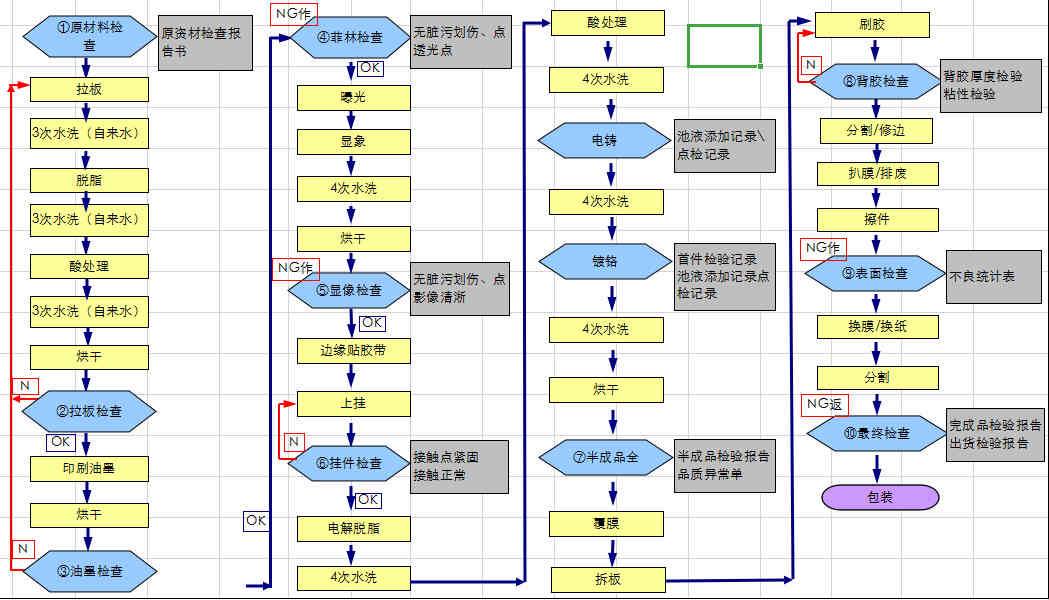 電鑄薄標生產(chǎn)工藝大致流程為:原材料檢查→拉板檢查→油墨檢查→菲林檢查→顯像檢查→掛件檢查→電鑄→鍍鉻→覆膜→刷膠→背膠檢查→表面檢查→最終檢查→包裝