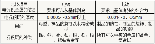 電鑄與電鍍的最大不同是,電鍍的產品是被鍍件和產品的復合體,而電鑄則只是以電沉積層為所需要的制品,最終要將鍍層與母型脫離。電鑄與電鍍的區(qū)別如下表: